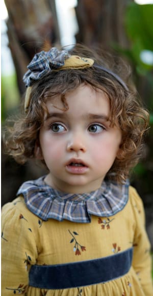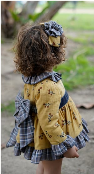 Jesusito formado por vestido cortito de color mostaza con flores, con volantes a cuadros en el cuello, en los puños y en el bajo. Con fajín de terciopelo gris oscuro en talle. Con lazo a cuadros en espalda. Braguita y capota incluidas.